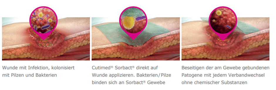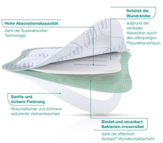 Cutimed® Siltec® Sorbact® B reduziert die Keimzahl in der Wunde und saugt das Exsudat auf. Der innovative Wundverband vereint das effektive Exsudatmanagement von Cutimed Siltec mit der wirkstofffreien antimikrobiellen Wirkung von Cutimed Sorbact. Auf Basis der hydrophoben Wechselwirkung und ohne der Verwendung chemischer Substanzen (Sorbact-Prinzip) werden Keime aus der Wunde gebunden und inaktiviert. Durch die feuchtigkeitsregulierende und hochatmungsaktive Deckfolie sinkt das Mazerationsrisiko bei mäßig bis stark exsudierenden Wunden. Ein hautfreundlicher Silikon-Haftrand sorgt für eine sanfte Fixierung und einen atraumatischen Verbandwechsel.