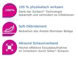 Cutimed® Siltec® Sorbact® B besteht aus einem Acetatgewebe mit einer bakterienbindenden Beschichtung und einem hochabsorbierenden, offenporigen Polyurethanschaum mit Silikon-Haftrand. Die spezielle Beschichtung mit DACC (Dialkylcarbamoylchlorid) verleiht Cutimed Siltec Sorbact stark wasserabweisende Eigenschaften. So wird mit jedem Verbandwechsel die Keimzahl in der Wunde reduziert. Dadurch werden optimale Bedingungen für den natürlichen Wundheilungsprozess geschaffen. Gleichzeitig sorgt der Schaumkörper und die integrierten Superabsorber für eine vertikale Absorption des Exsudats. Durch die hochatmungsaktive Folie sinkt das Mazerationsrisiko bei mäßig bis stark exsudierenden Wunden. Ein hautfreundlicher Silikon-Haftrand sorgt für eine sanfte Fixierung und eine atraumatischen Verbandwechsel.