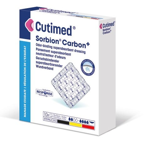 Cutimed® Sorbion® Carbon+ ist ein steriler, hydroaktiver, gelbildender, stark exsudatabsorbierender Wundverband, der eine effektive und dauerhafte Reduzierung wundbedingter Gerüche bewirkt. Dies basiert auf der zweifachen Wirkung von Aktivkohle und natürlich vorkommenden Mineralien. Cutimed® Sorbion® Carbon+ besteht aus einem stark wasserhaltenden, superabsorbierenden Kern, einer Wundkontaktschicht aus einem hypoallergenen Polypropylen und einer atmungsaktiven, wasserdichten Rückseite aus Polyurethan.