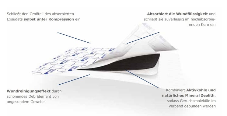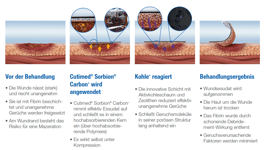 Cutimed® Sorbion® Carbon+ absorbiert und speichert Wundflüssigkeiten im superabsorbierenden Kern auch unter Kompression zuverlässig. Dies führt zur Beseitigung wundheilungshemmender Faktoren, wie u. a. von Bakterien, Proteasen und entzündlichen Überträgerstoffen, und minimiert das Risiko von Mazeration. Gleichzeitig sorgt der Verband für ein feuchtes Wundmilieu, welches die körpereigene Wundheilung unterstützt. Die hohe Aufnahmekapazität von Cutimed Sorbion® Carbon+ ermöglicht im Vergleich zu herkömmlichen Wundverbänden eine längere Wundruhe. Das verbesserte Flüssigkeitsaufnahmevermögen reduziert unangenehme Gerüche. Totes Gewebe haftet am Verband und wird beim Verbandwechsel sanft entfernt, wodurch die Wundreinigung unterstützt wird (Soft Débridement). Die obere Schicht ist besonders flexibel, wasserdicht und atmungsaktiv und fungiert als Bakterienbarriere. Durch die Wundkontaktschicht können kleine schwarze Partikel sichtbar sein. Dies tritt bei Produkten, die Aktivkohle enthalten, häufig auf und hat keinen Einfluss auf die Leistung und Sicherheit des Produkts.