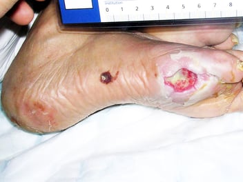 Ein Fersendekubitus, auf welchem sich über einer freiliegenden Sehne Fibrinbeläge gebildet haben. Durch eine erhöhte Keimbesiedelung wurde ein unangenehmer Wundgeruch wahrgenommen.