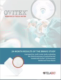 To report the one year results in the first 32 patients enrolled in the BRAVO clinical trial (“Bioscaffold Reconstruction of Abdominal wall and Ventral hernia defects with Open or laparoscopic repair”). This prospective single-arm study evaluates the clinical performance of a Reinforced Biologic (RB) to reinforce repairs in 100 patients with a variety of ventral hernias.