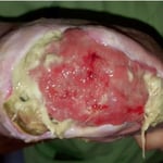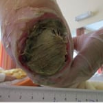 Wundfüller: Nekrotischer Bereich mit LIGASANO grün steril, übriger Wundbereich mit LIGASANO weiß steril, 1cm dick