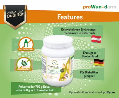 Aus diesem Grund vertreibt sorbion austria ab sofort das von Ärzten entwickelte Nahrungsergänzungsmittel proWun+darm, das dem Körper alle elementaren Nährstoffe zuführt, komplexe immunologische Prozesse unterstützt und Wundheilung von innen fördert.